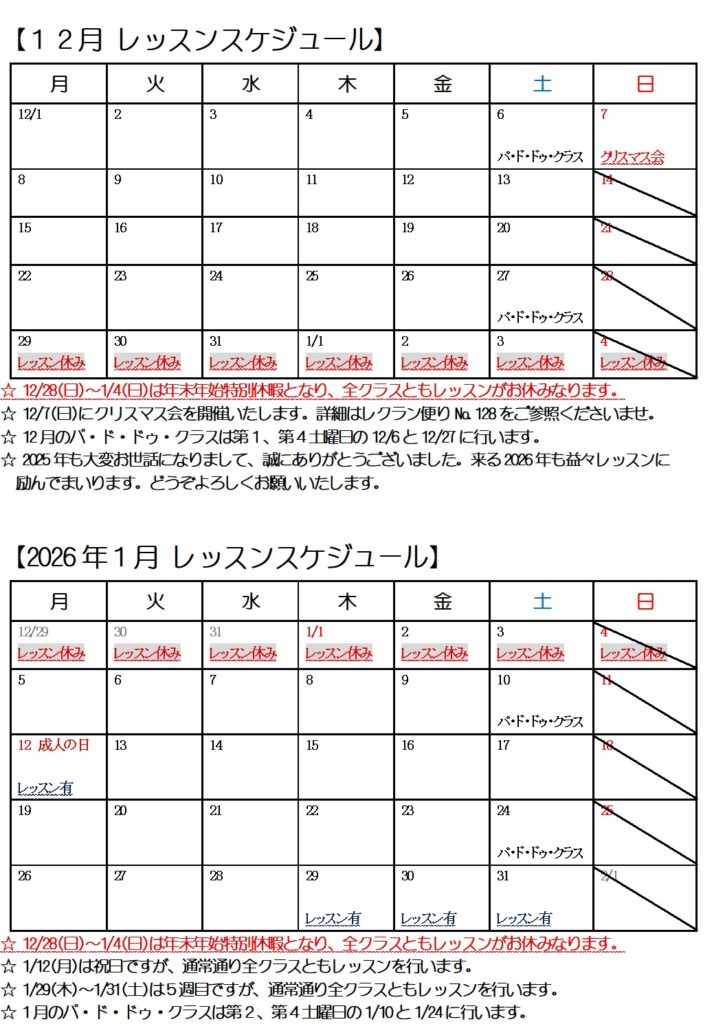 12月2026年1月の月間スケジュール